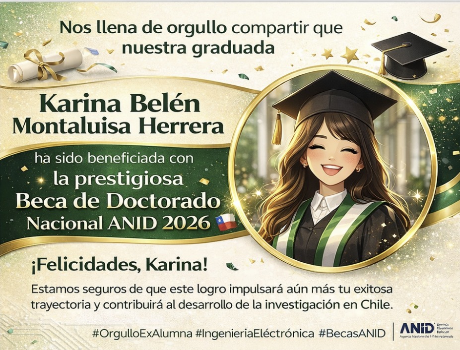 Nuestra graduada Karina Belén Montaluisa Herrera, de la carrera de Ingeniería Electrónica y Automatización de la Universidad de las Fuerzas Armadas ESPE, ha sido beneficiaria de la prestigiosa Beca de Doctorado Nacional ANID 2026, un importante reconocimiento otorgado a investigadores con alto potencial académico.